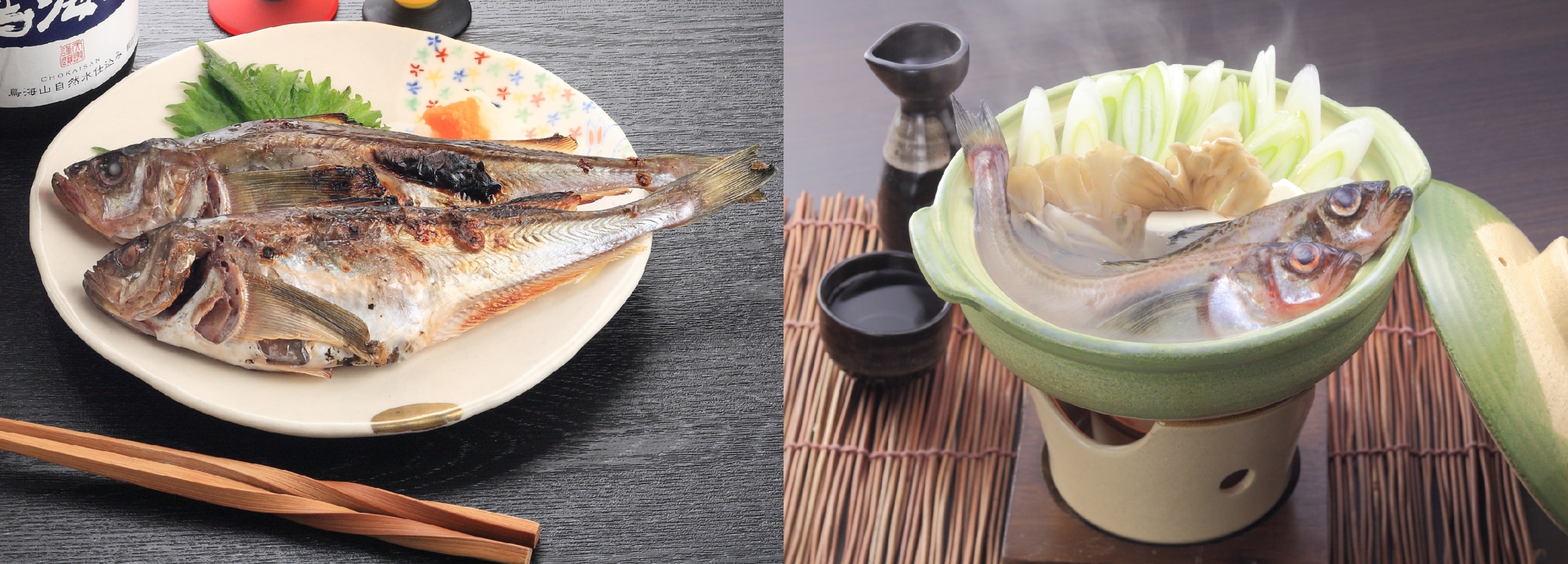 Có thể được thưởng thức Hata-hata theo nhiều cách: nướng trong lò, chiên, sấy khô, ngâm chua, nướng trên than (ảnh phía trên bên trái) và thậm chí là làm thành lẩu shottsuru (ảnh phía trên bên phải). (Nguồn ảnh: Tỉnh Akita)