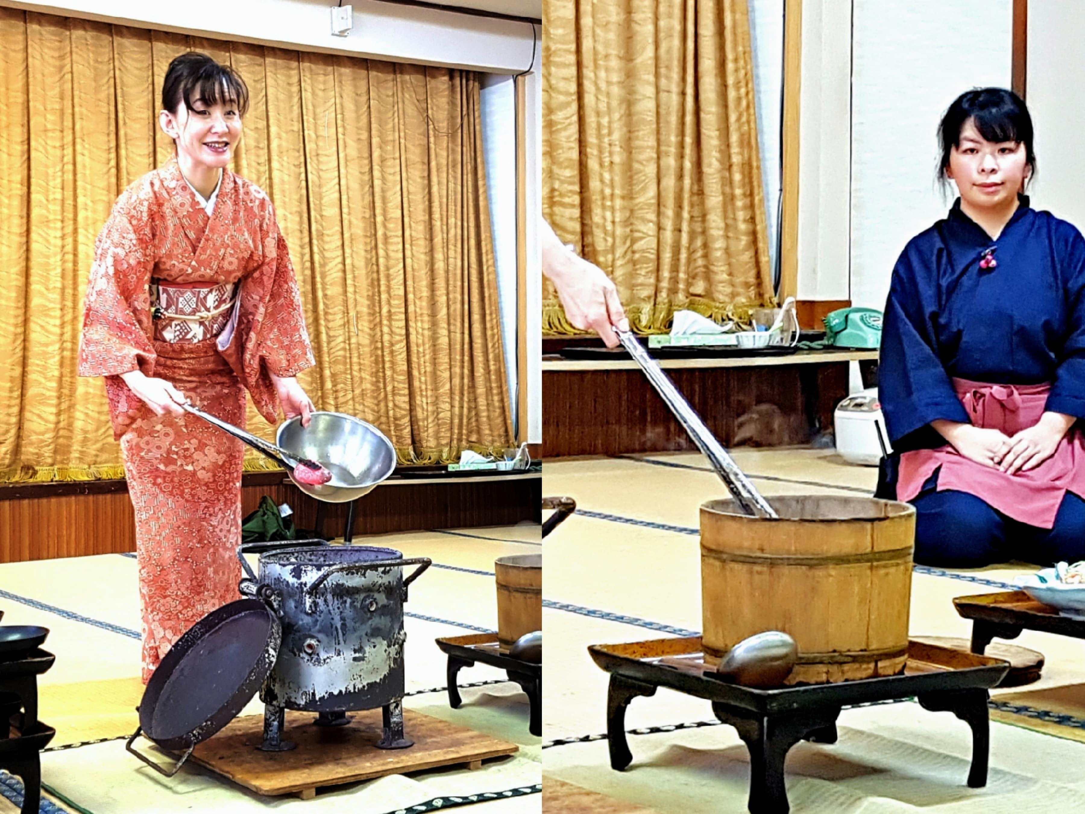 Lẩu Ishiyaki được nấu bằng cách bỏ một viên đá nóng đỏ vào nồi, để nó đun sôi nước dùng, như hình minh họa ở trên. (Nguồn ảnh: JR East / Carissa Loh)