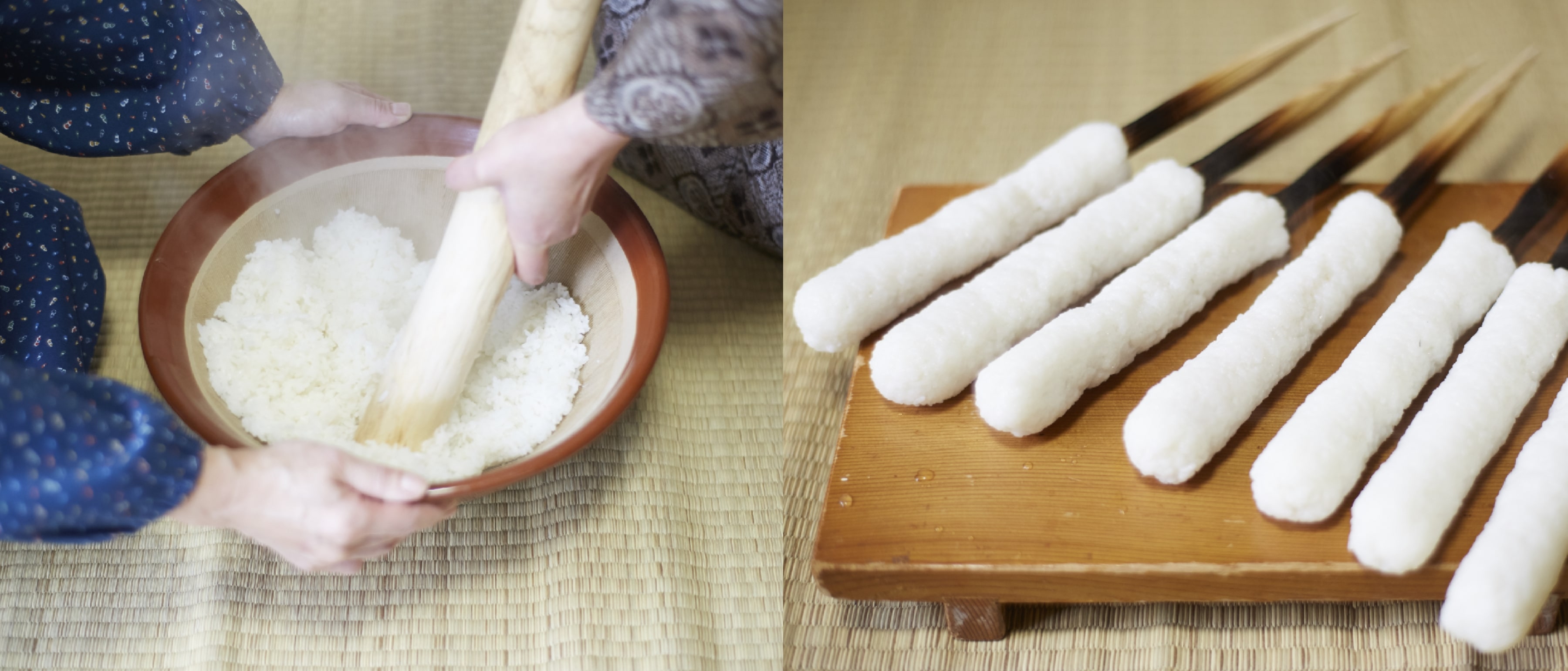 Để làm kiritanpo, gạo mới nấu được giã rồi nặn, bọc xung quanh que xiên làm từ gỗ cây tuyết tùng Nhật Bản, trước khi đem nướng chậm trên bếp than mở. (Nguồn ảnh: Akita Prefecture)