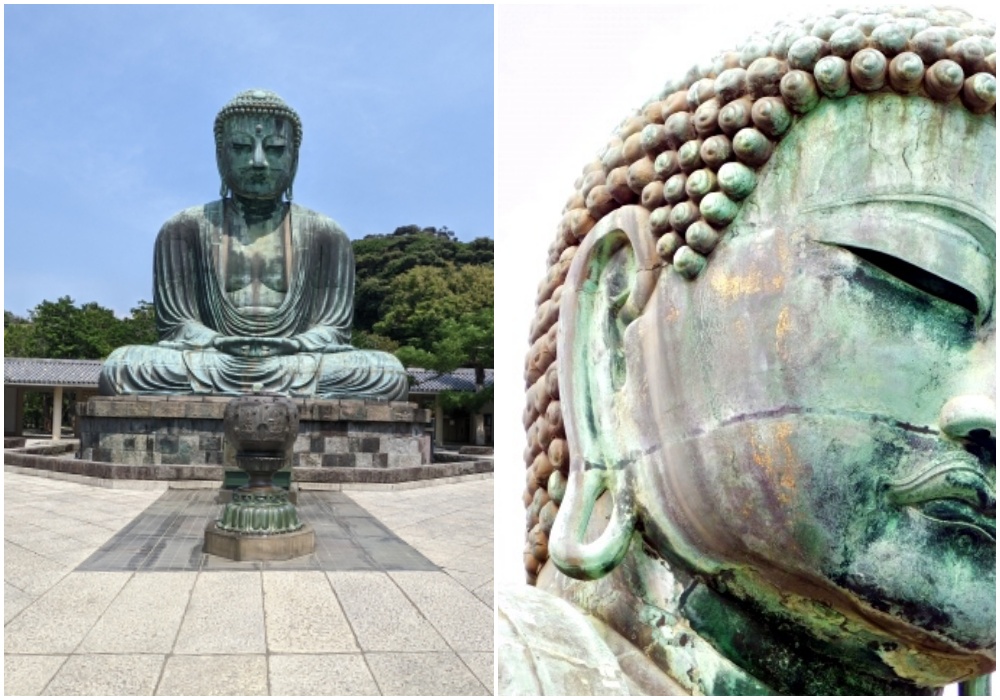 Tượng Phật Khổng Lồ Kamakura, và cận cảnh phần dát vàng còn sót lại trên bề mặt tượng. (Nguồn ảnh: photoAC)