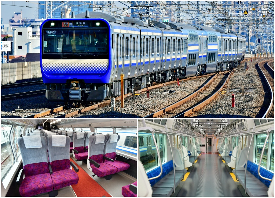 Chuyến tàu E235 mới trên tuyến JR Yokosuka (trên cùng), và các ghế ngồi hạng Green Car (dưới cùng bên trái), cùng ghế thường (dưới cùng bên phải). (Nguồn ảnh: JR East)