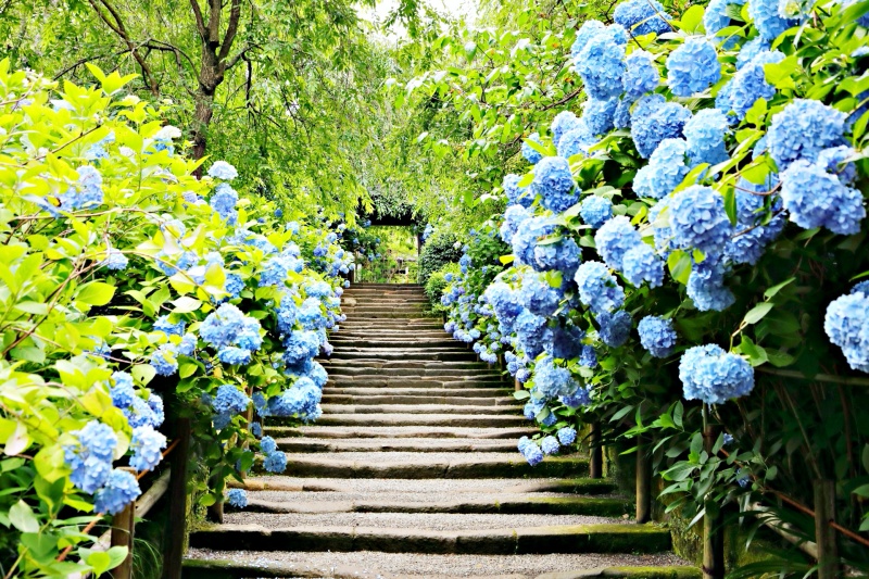 Cẩm tú cầu ở Meigetsuin thường nở vào tháng 6, trong mùa mưa. Thay vì ủ rũ bởi thời tiết ẩm ướt, hãy vui vẻ trông đợi những bông cẩm tú cầu tuyệt đẹp tại Meigetsuin nở hoa nhé!
