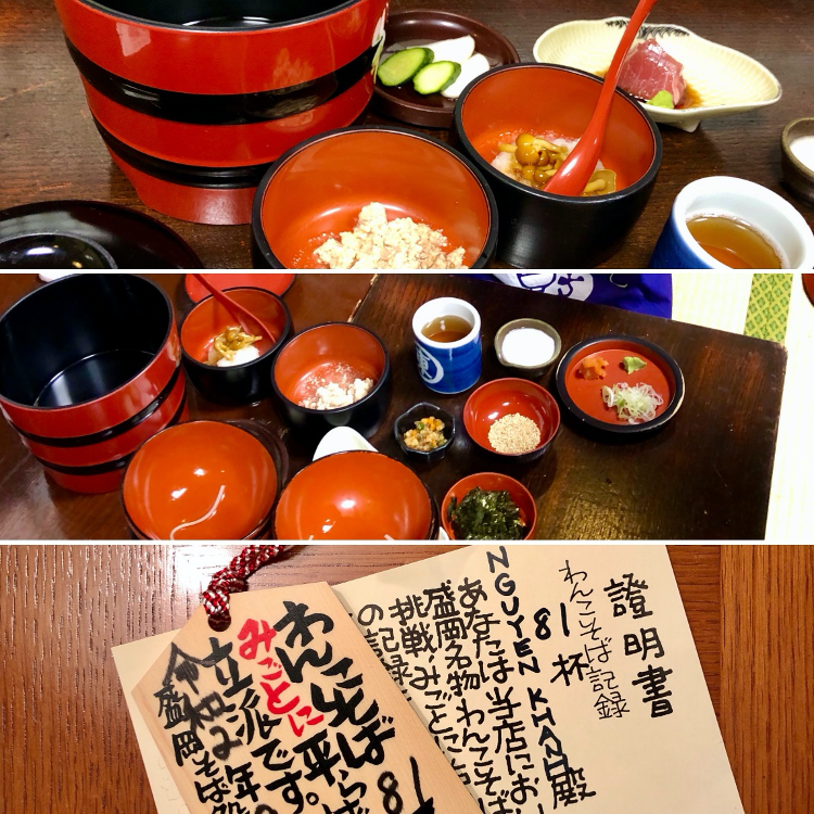 Thông thường, nam giới có thể ăn trung bình 70 chén, còn nữ giới khiêm tốn hơn 1 chút với 50 chén. Nếu ăn được hơn 100 chén, bạn sẽ được tặng giấy chứng nhận và một món quà lưu niệm xinh xắn. Kỷ lục hiện nay do 1 phụ nữ ở Morioka nắm giữ sau khi ăn 570 chén mì. Được nhân viên của quán cổ vũ nhiệt tình và cố gắng hết sức, nhưng mình cũng đành tiếc nuối dừng lại ở con số 81. Tuy nhiên, đối với mình đây quả thực đã là một con số thần kỳ rồi! Để khích lệ tinh thần cho bọn mình, chủ quán cũng vui vẻ tặng bọn mình giấy chứng nhận và quà lưu niệm thật dễ thương. Lần sau bọn mình sẽ cố gắng hơn để ăn được 100 chén!