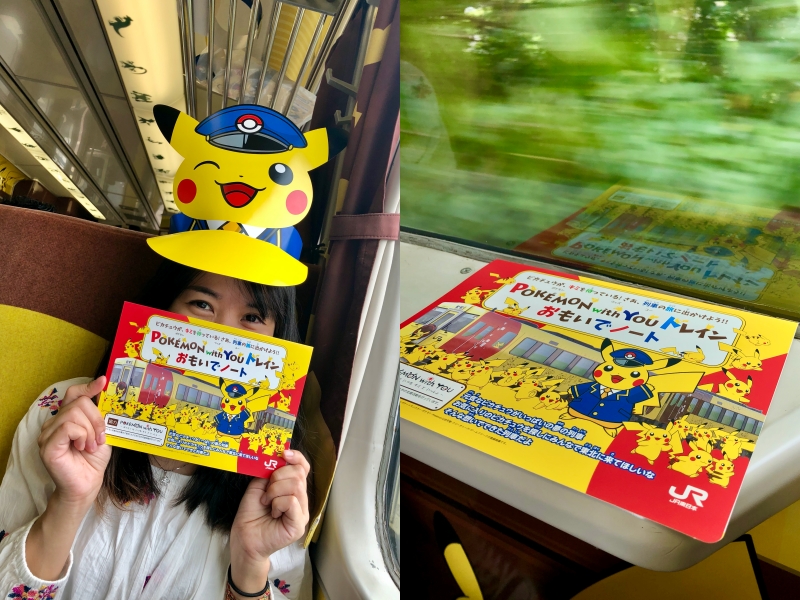Ngay khi vừa lên tàu, nhân viên hướng dẫn chỗ ngồi và phát cho bọn mình 1 chiếc túi nhỏ. Để xem trong túi có gì nào? Woa, là một chiếc mũ có hình chú Pikachu thật dễ thương cùng phiếu sưu tập bộ 6 con dấu các ga trên hành trình: ga Ichinoseki, Surisawa, Senmaya, và Kesennuma. Sưu tập đủ bộ 6 con dấu là bạn có thể đổi lấy món quà dễ thương là mô hình đoàn tàu POKÉMON with YOU Train bằng bìa cứng.
