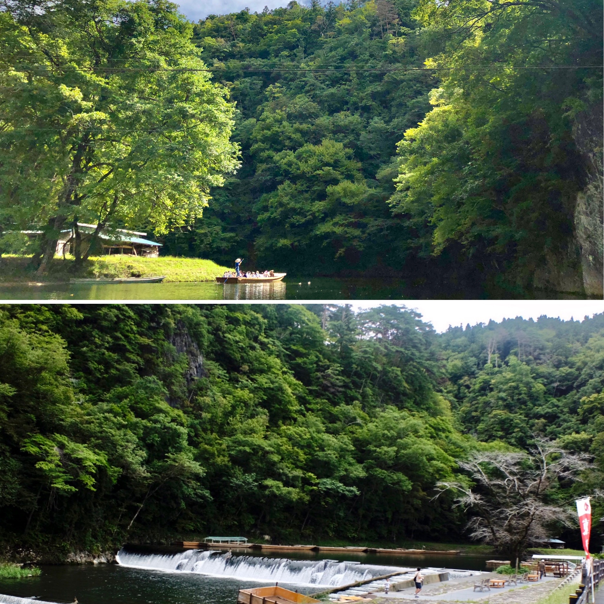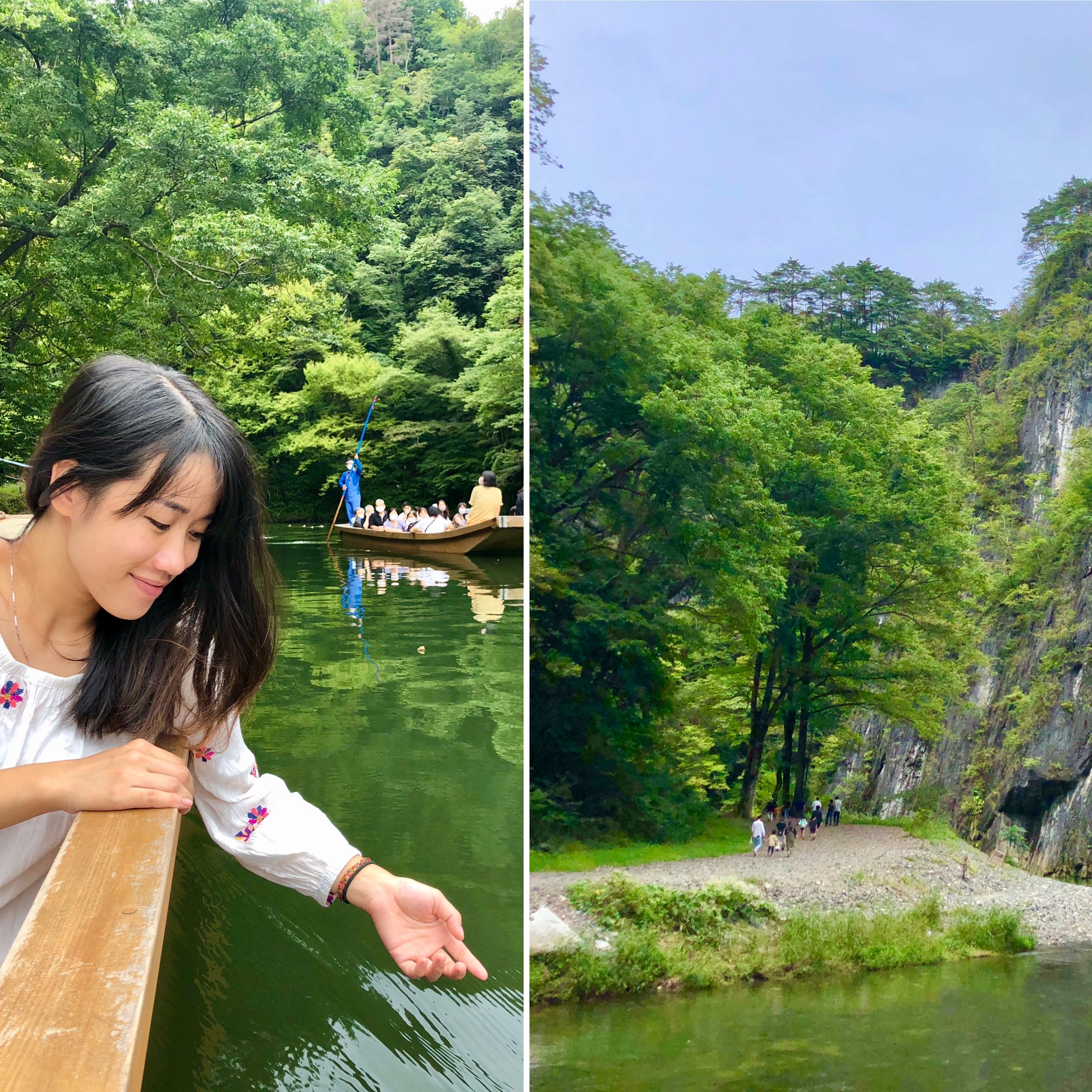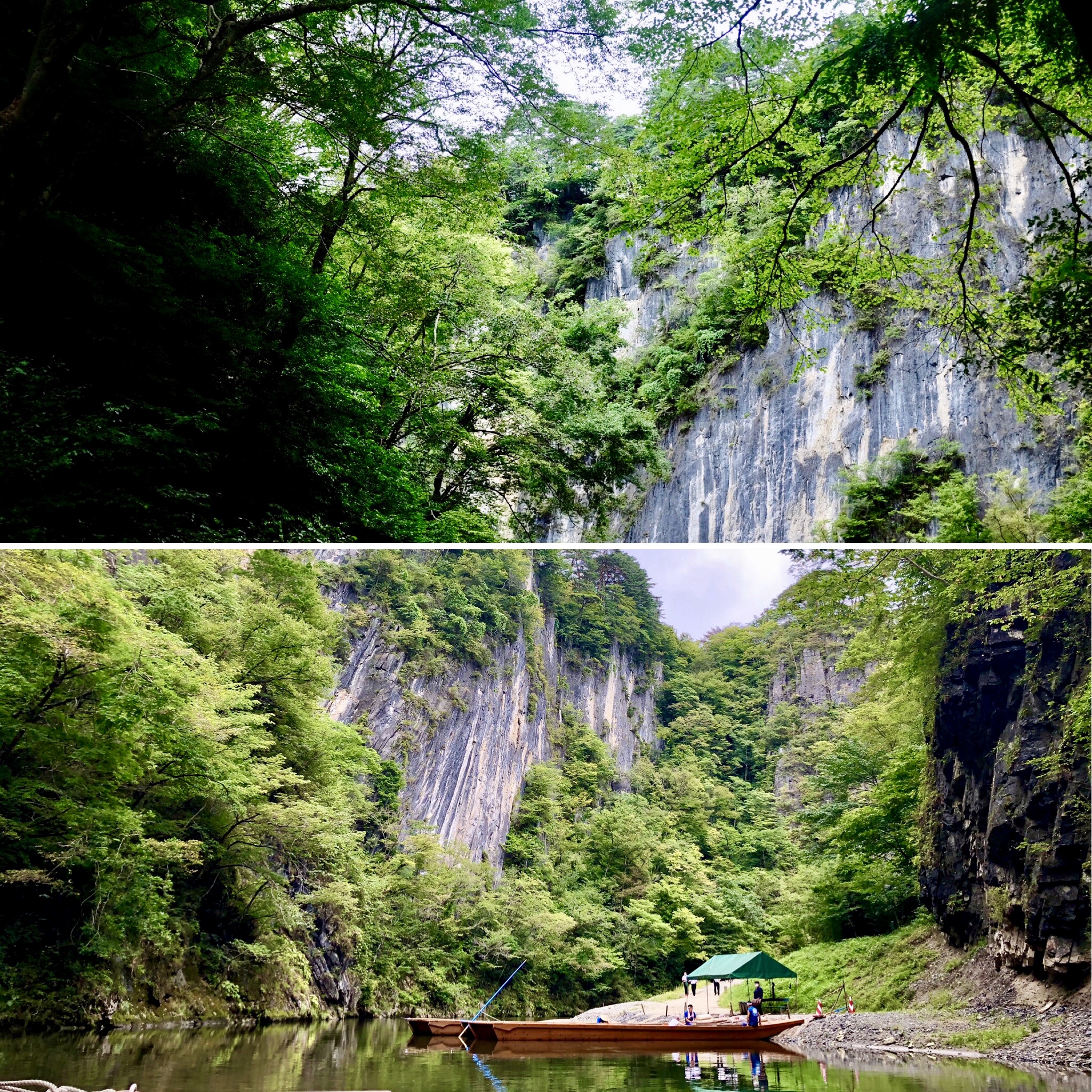 Được giới thiệu từ trước, bọn mình mua vé để đi thuyền tham quan dọc theo hẻm núi (thời gian 1 tiếng rưỡi, giá vé cho 1 người là 1.800 yên). Những chiếc thuyền ở đây đều không có động cơ và người chèo thuyền chỉ dùng 1 cây sào để điều khiển, một điều không dễ gì bắt gặp ở đất nước hiện đại như Nhật Bản. Trong suốt chuyến đi, người chèo thuyền sẽ biểu diễn các bài hát dân gian và kể cho bạn những câu chuyện thú vị về hành trình của cá hồi bơi ngược lên thượng nguồn con sông vào khoảng tháng 10.