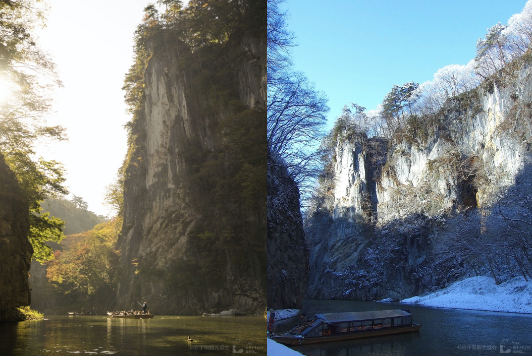 Cảnh sắc đẹp mê hồn ở Geibiki vào mùa thu (trái) và mùa đông (phải). (Nguồn: Hiệp hội du lịch tỉnh Iwate)