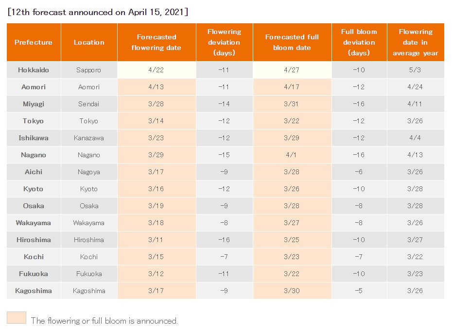 Dự báo về thời gian hoa anh đào nở của Japan Meteorological Corporation vào năm 2021. (Nguồn ảnh: Japan Meteorological Corporation)