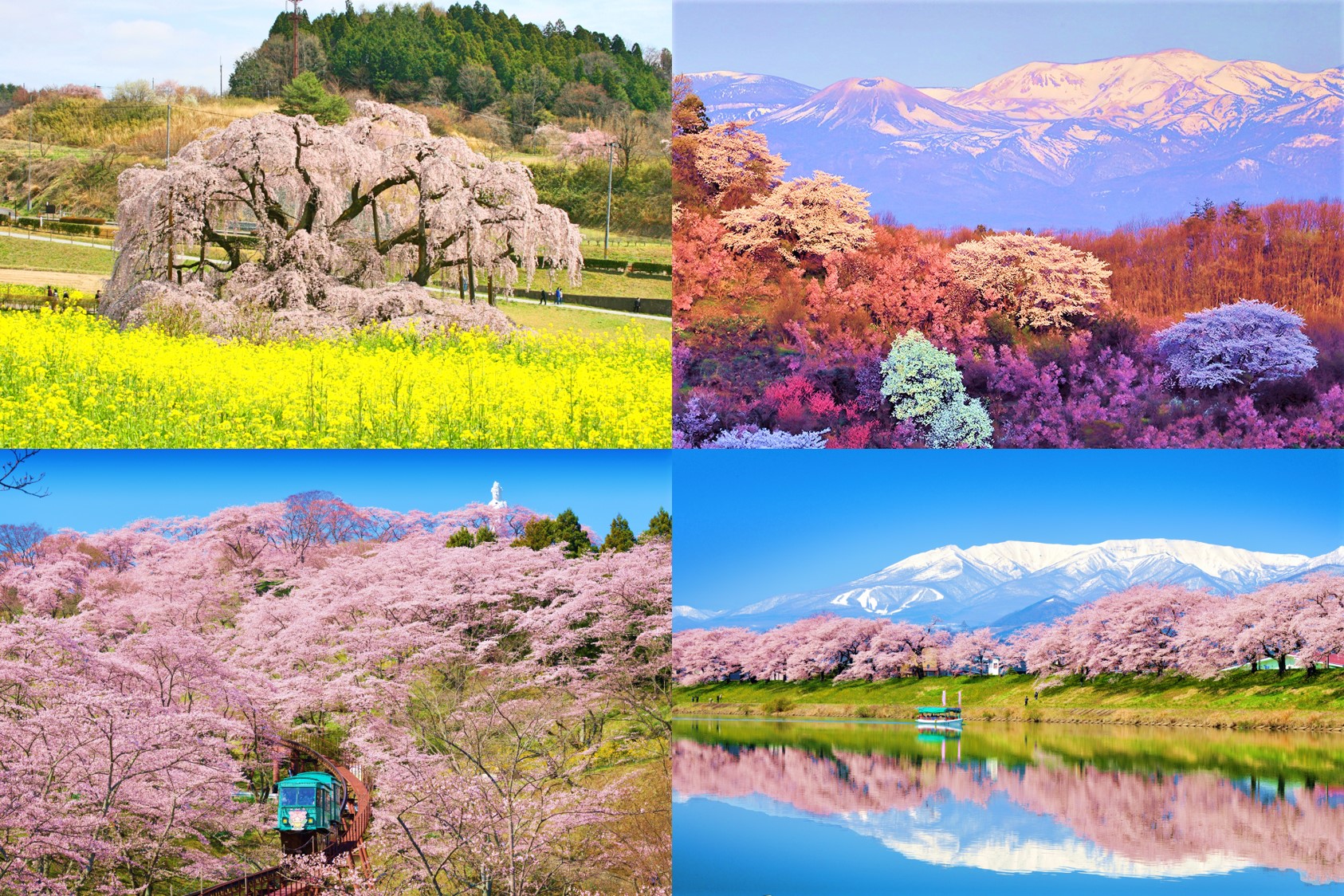 Theo chiều kim đồng hồ từ trên cùng bên trái: Miharu Takizakura, Công viên Hanamiyama, Hitome Senbonzakura, Công viên Funaoka Joshi. (Nguồn ảnh: JR East / Nakamura, Fukushima Prefecture, U-Media)