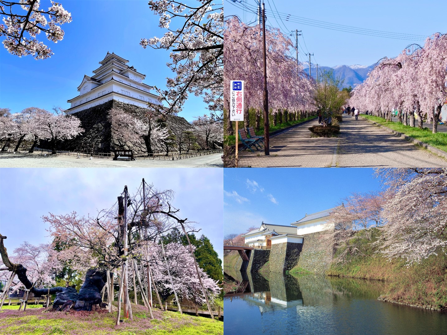 Theo chiều kim đồng hồ từ trên cùng bên trái: Công viên Lâu đài Tsuruga, Nicchusen Shidarezakura, Công viên Kajo, Isazawa no Kubozakura. (Nguồn ảnh: Nguyễn Duy Khánh, Tỉnh Yamagata)