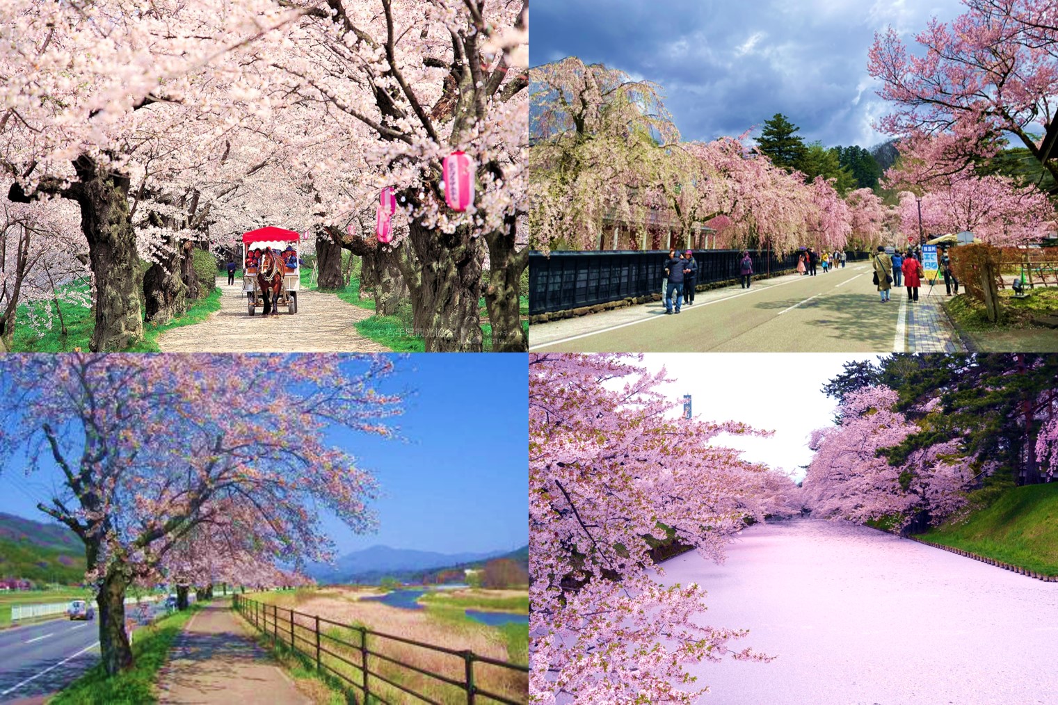 Theo chiều kim đồng hồ từ trên cùng bên trái: Công viên Kitakami Tenshochi, Khu nhà ở Samurai Kakunodate, Công viên Hirosaki, Ayaori no Sakura-namiki. (Nguồn ảnh: 岩手県観光協会, Japanmase, Tỉnh Aomori)