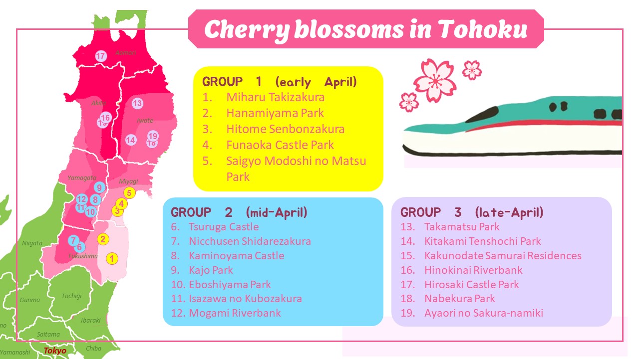 Bởi không giống như hầu hết các vùng khác ở Nhật Bản, Tohoku có hình dạng địa lý độc đáo. Vùng đất này trải dài từ nam ra bắc, và vì thời kỳ hoa anh đào nở tịnh tiến dần về phía bắc, nên du khách có thể theo đó mà ngắm hoa trong vùng. Điều quan trọng là lập kế hoạch du lịch bằng cách gộp nhóm các địa điểm ngắm hoa anh đào theo thời kỳ nở rồi ghé thăm vào ngày phù hợp.