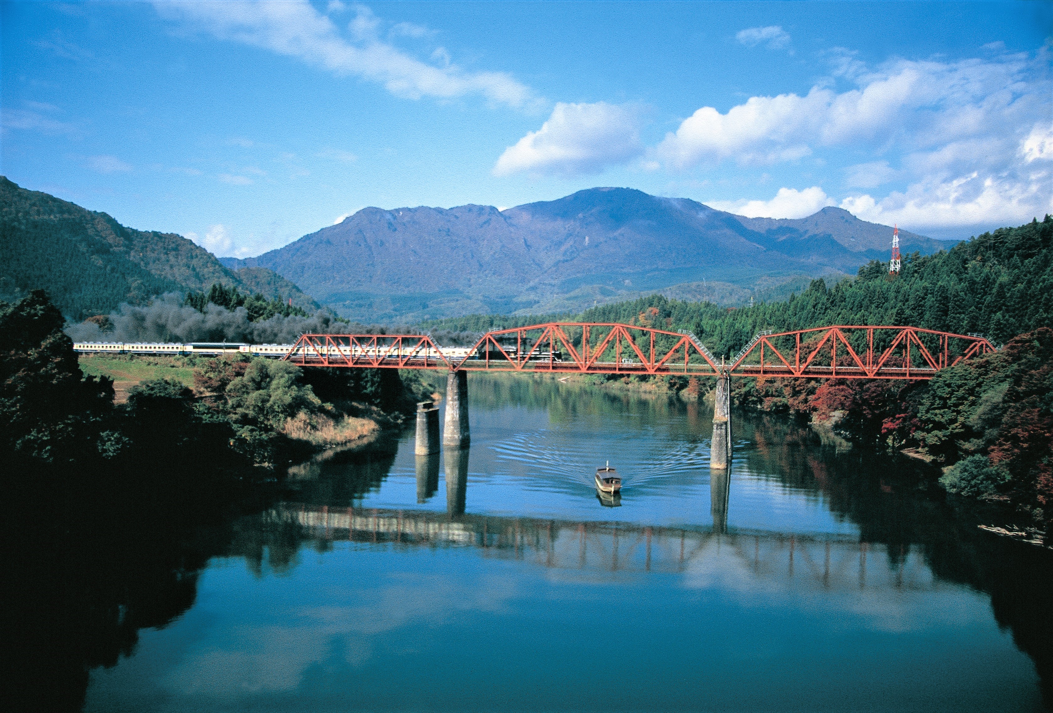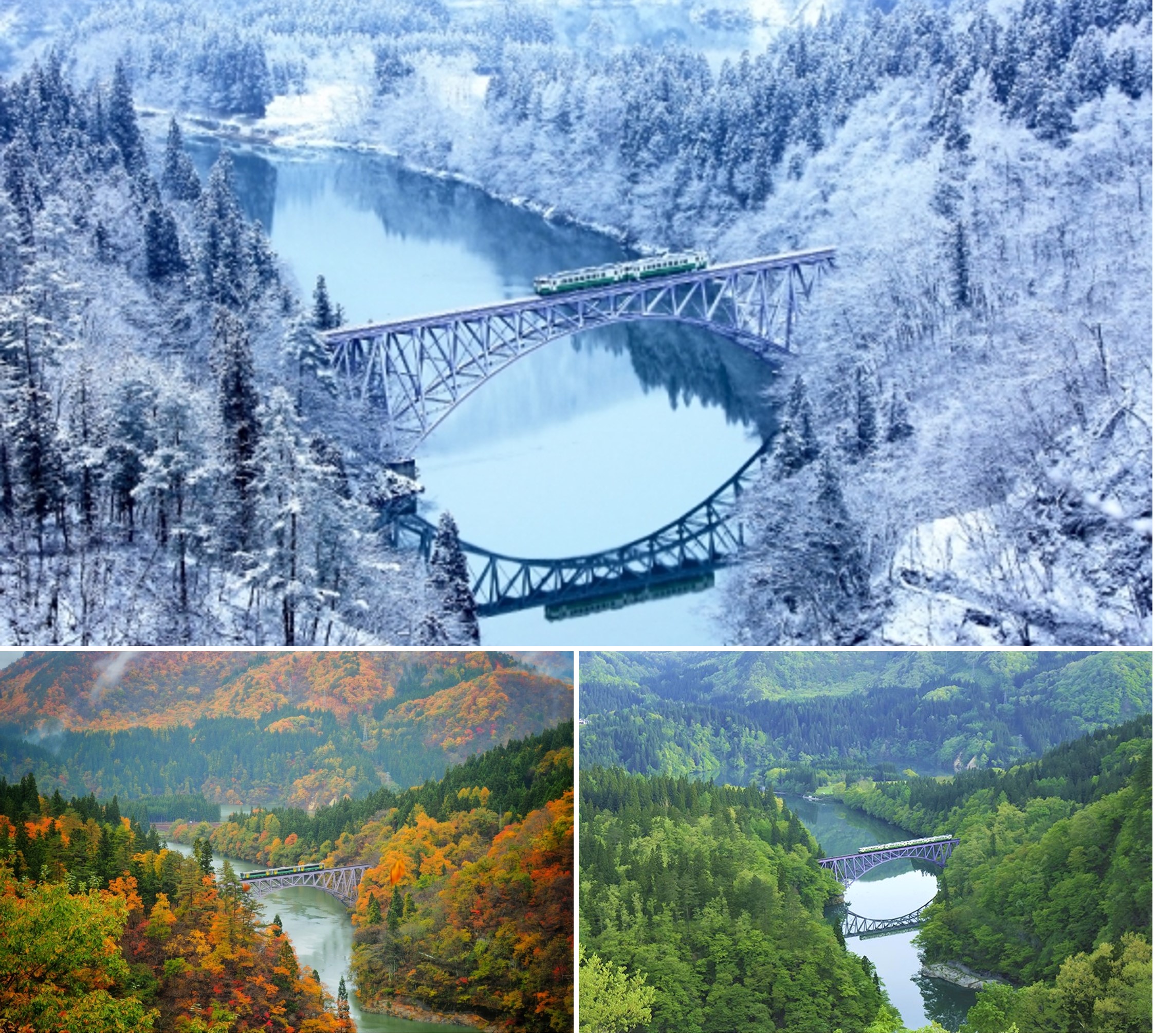 Tuyến Tadami ở Cầu sông Tadami Số 1 vào mùa đông (ảnh trên cùng), mùa thu (phía dưới, bên trái), và mùa hè (phía dưới, bên phải). (Nguồn ảnh: kenko hoshi / JNTO (trên cùng), KrobkruengJapan (phía dưới, bên trái), 福島県観光物産交流協会 (phía dưới, bên phải))