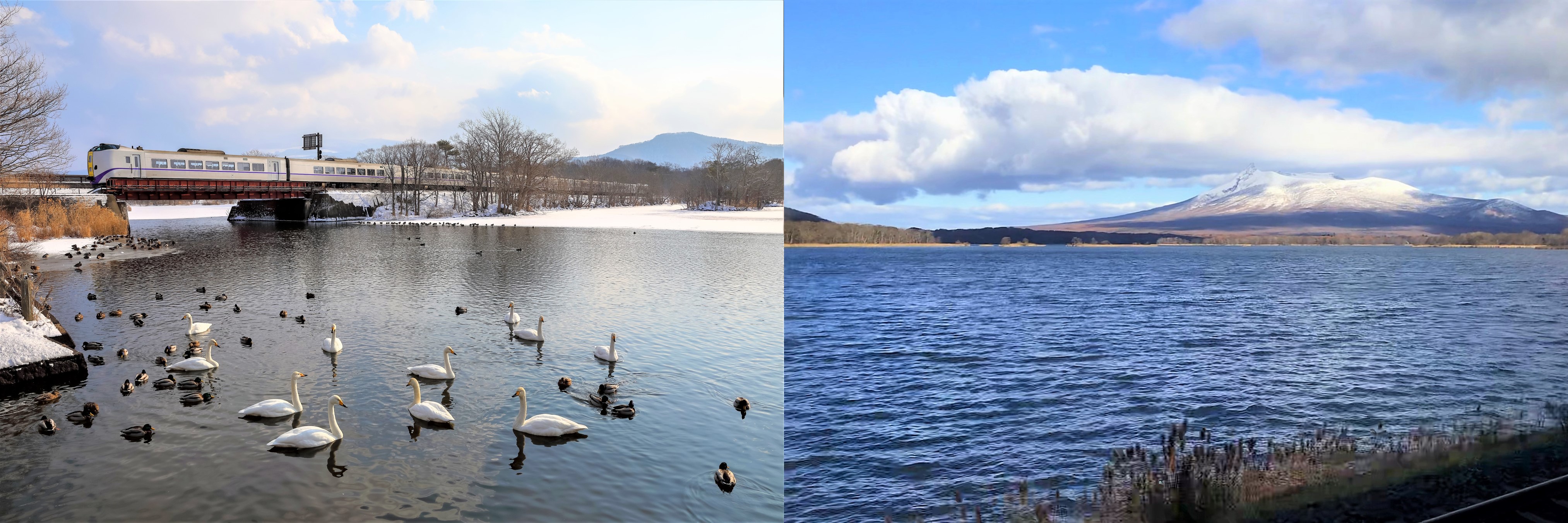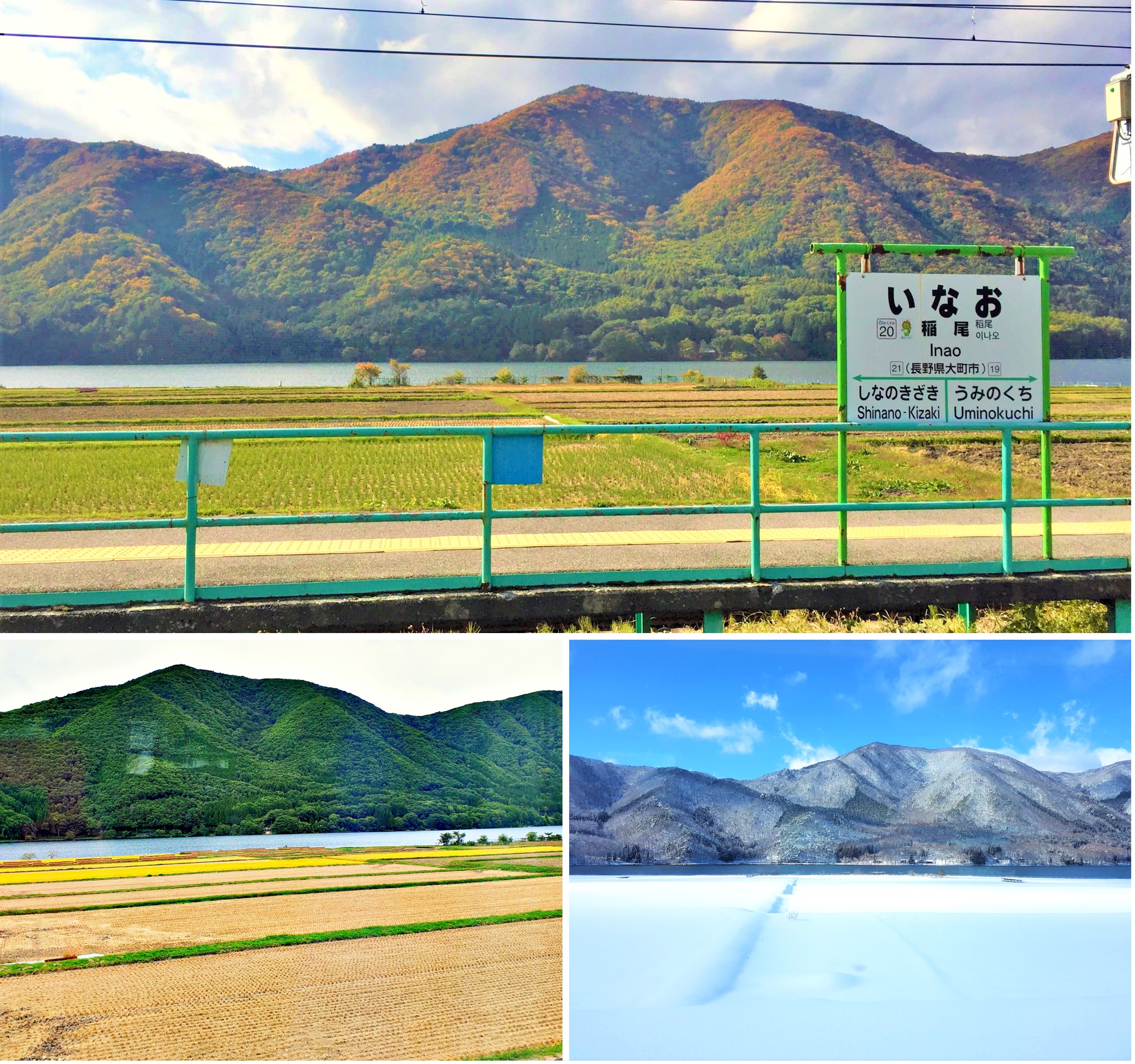 Hồ Kizaki vào mùa thu (ảnh trên, và ảnh dưới, bên trái) và mùa đông (ảnh dưới, bên phải) tại ga JR Inao. (Nguồn ảnh: JR East / Kobori (trên), JR East / Carissa Loh (dưới))