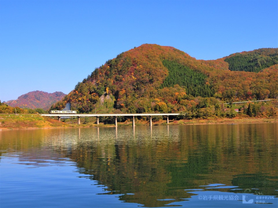 Tuyến Kitakami chạy ngang qua hồ Kinshu vào mùa thu. (Nguồn ảnh: 岩手県観光協会)