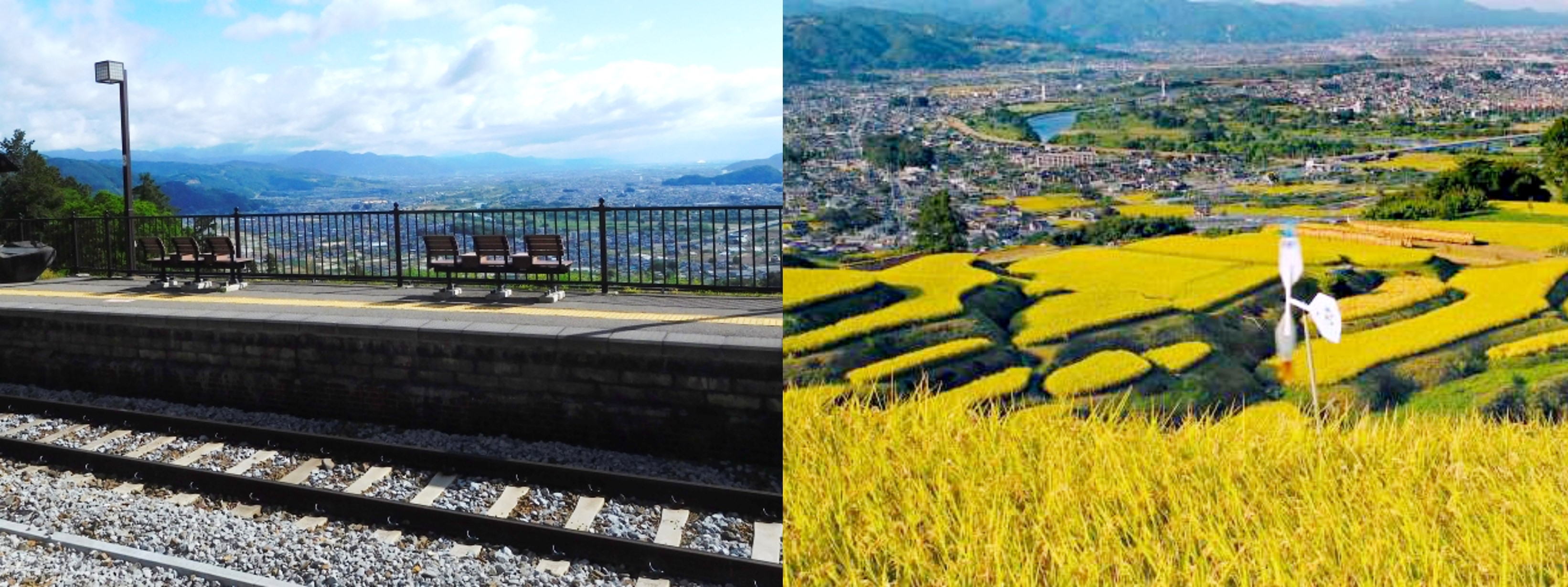 Tầm nhìn từ sân ga JR Obasute (bên trái) và những cánh đồng lúa (bên phải) nhìn từ nhà ga. (Nguồn ảnh: photoAC (bên trái), 信州千曲観光局 (bên phải))