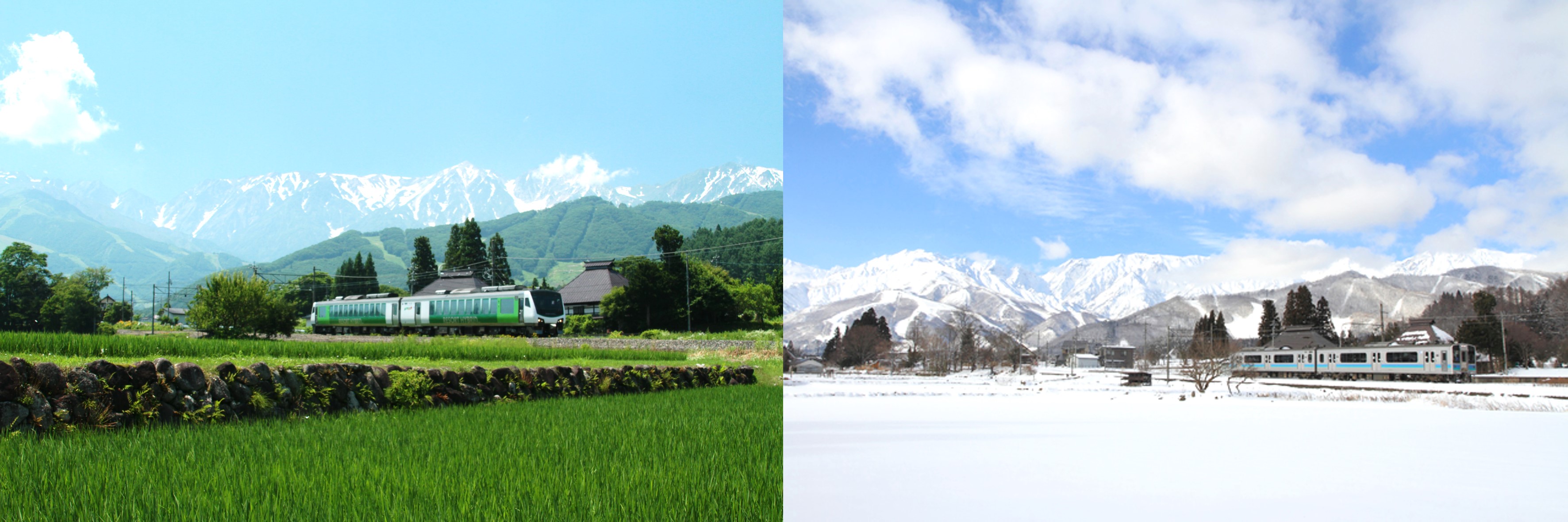 Ba Ngọn Núi Hakuba vào mùa hè (bên trái) và mùa đông (bên phải), có thể nhìn thấy ở chân trời xa xa phía sau Tuyến Ōito. (Nguồn ảnh: JR East Nagano Branch (bên trái), alps / PIXTA (bên phải))
