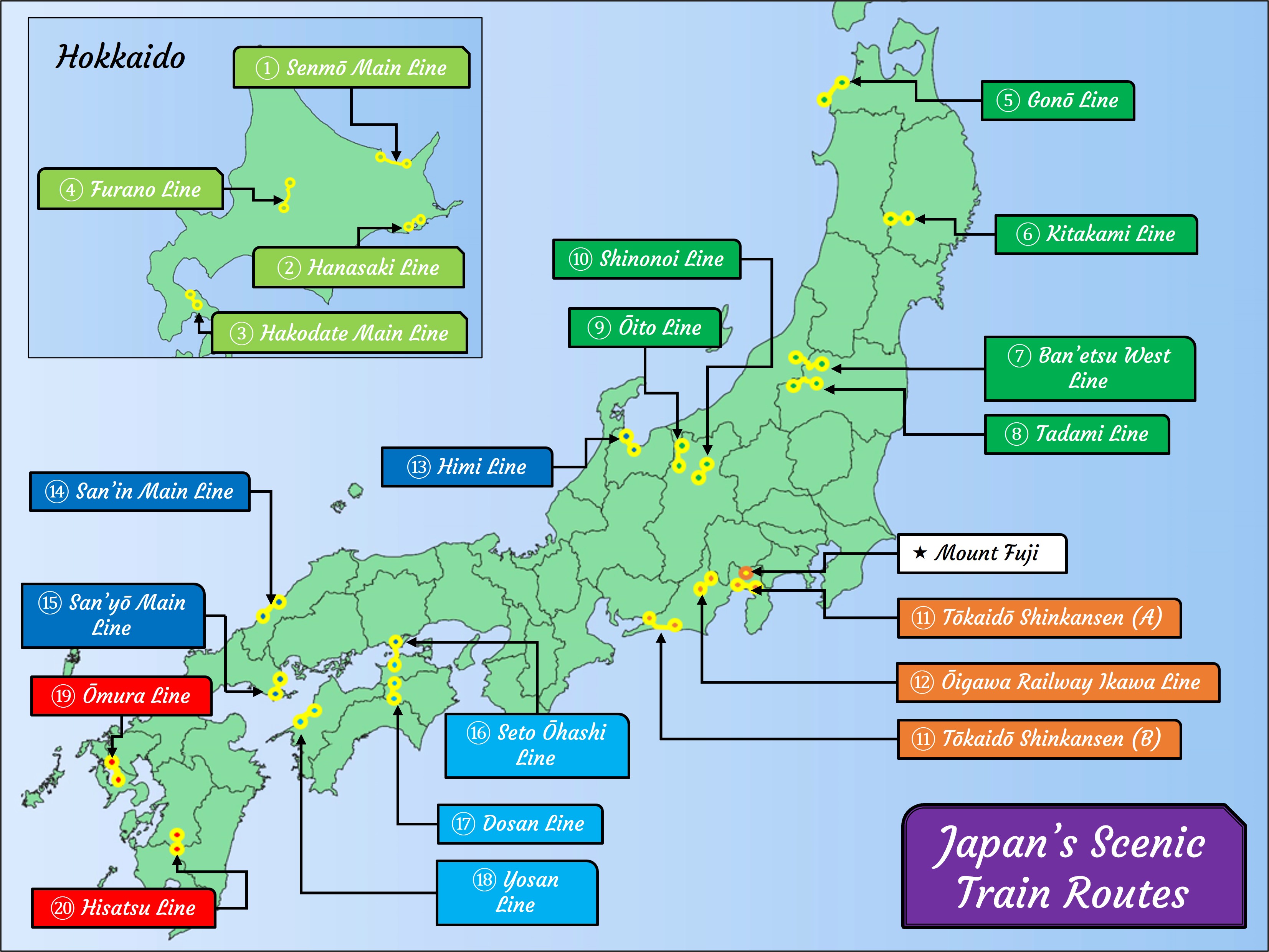Sơ đồ những tuyến đường sắt có phong cảnh đẹp ở Nhật Bản. (Nguồn ảnh: JR Times)