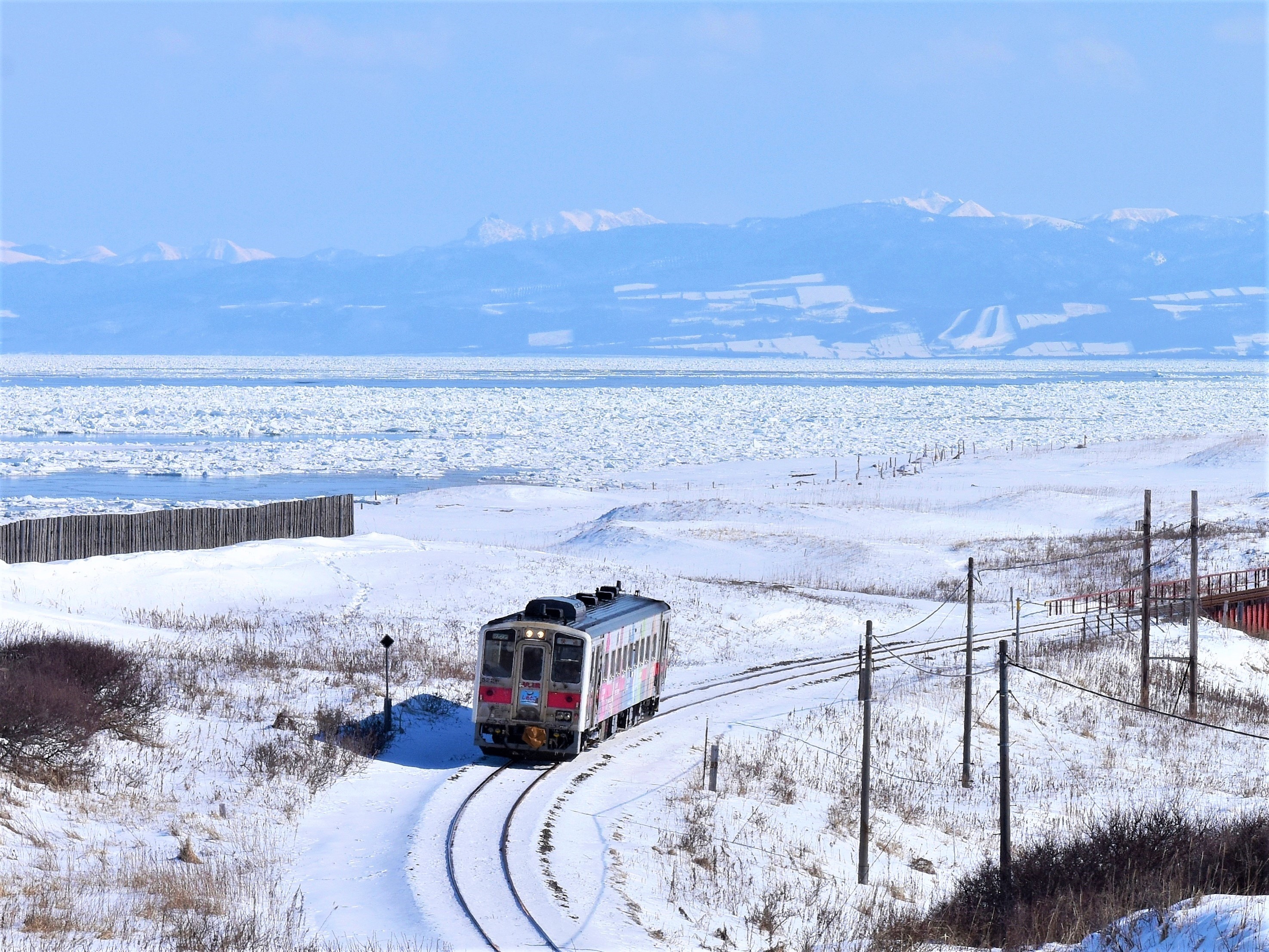 Chúng mình bắt đầu hành trình bằng chuyến đi đến tỉnh cực bắc Hokkaido, nơi có một tuyến tàu chạy dọc đường bờ biển đối diện Biển Okhotsk (オホーツク海). Tuyến Chính Senmō do JR Hokkaido vận hành, đoạn đường ray giữa Abashiri và Shiretoko-Shari chạy rất gần biển, và hành khách có thể chiêm ngưỡng khung cảnh tuyệt vời khi đi qua đoạn đường này vào mùa đông.
