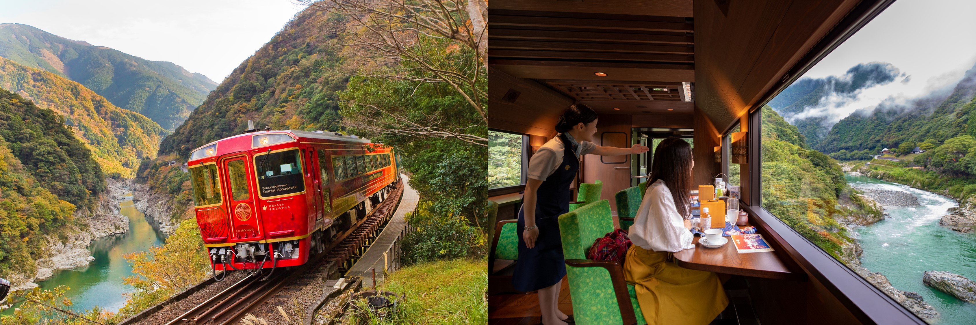 Nếu bạn muốn thử trải nghiệm một tuyến tàu hạng sang chạy qua các thung lũng vùng Shikoku, hãy lên tàu Shikoku Mannaka Sennen Monogatari! Đây là tàu ngắm cảnh hạng sang thuộc quyền vận hành của JR Shikoku, du khách có thể tận hưởng các dịch vụ tuyệt vời trong lúc thưởng ngoạn cảnh đẹp bên ngoài từ những cửa sổ lớn trên tàu. Tàu chỉ chạy một chuyến khứ hồi mỗi ngày từ ga JR Tadotsu đến ga JR Ōboke, và vì sức chứa cũng như lịch trình hoạt động hạn chế của tàu, hành khách được khuyến khích đặt chỗ trước.