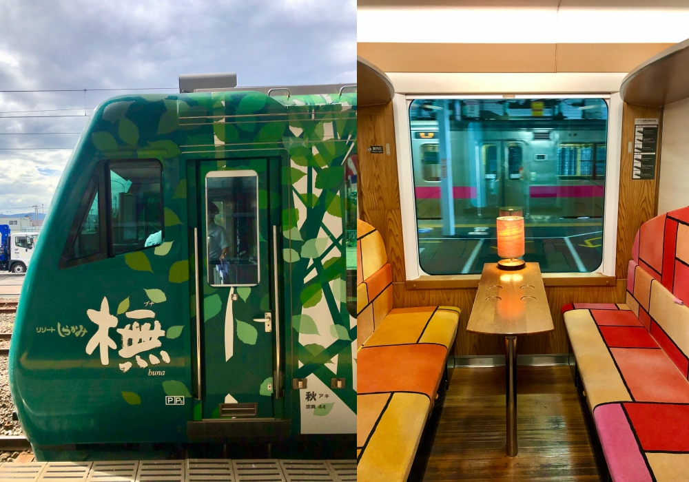 Resort Shirakami có 3 phiên bản khác nhau: Buna, Aoike và Kumagera. Tên các phiên bản được đặc theo tên các đặc trưng của vùng núi Shirakami mà tàu đi qua. Trong chuyến đi lần này, bọn mình có cơ hội được đi thử tàu Buna, trong tiếng Nhật có nghĩa là "cây dẻ gai". Đây là đoàn tàu mới nhất, được tân trang lại vào năm 2016 với màu xanh lá cây thể hiện cho sự hòa hợp với thiên nhiên tươi đẹp nơi đây. Phần nội thất bên trong tàu cũng thật đặc biệt, được làm bằng gỗ cây tuyết tùng nổi tiếng của vùng Akita nơi đoàn tàu đi qua. Tông màu tươi sáng bên trong tàu cũng mang lại cho hành khách cảm giác thật dễ chịu và ấm cúng. Trên tàu còn có wifi miễn phí nữa!
