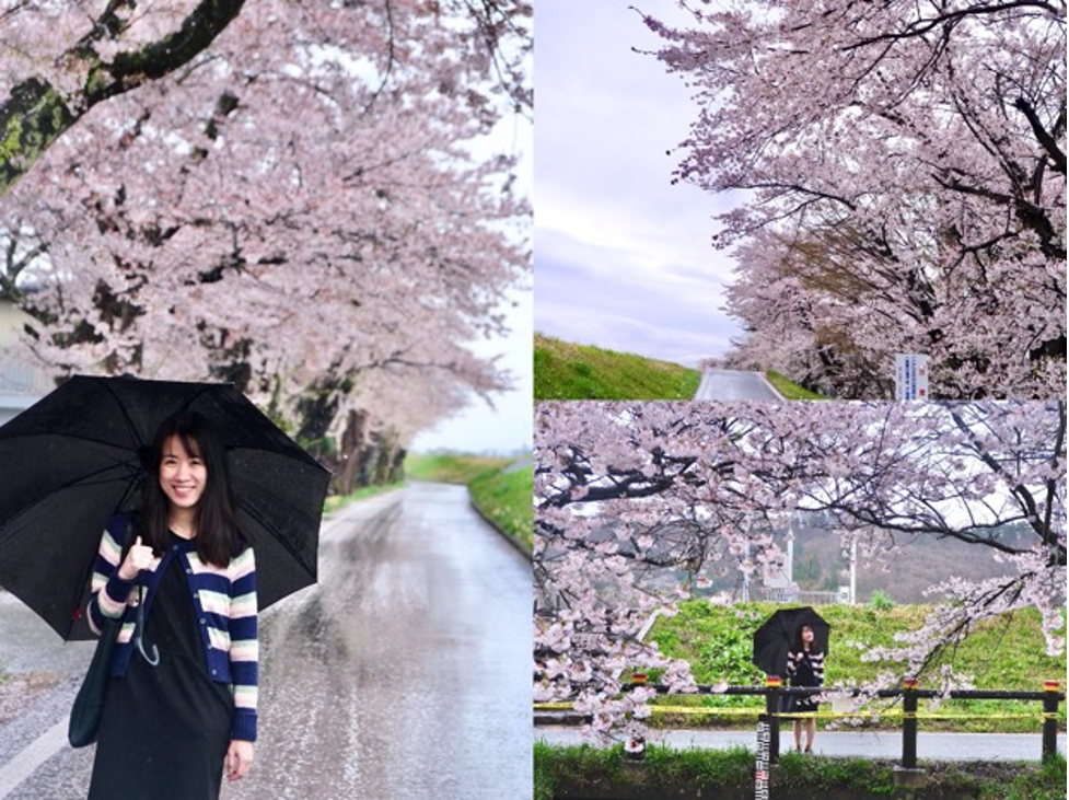 Vào những ngày đẹp trời, bạn có thể ngắm nhìn hàng cây anh đào nổi bật trên nền dãy núi tuyết phủ xa xa, quả thật là một bức tranh phong cảnh hùng vĩ! Vào những ngày trời đẹp, bạn có thể theo xe đạp chạy chậm rãi dọc theo con đường này để ngắm cảnh, rất tiếc lúc chúng mình đến thì trời lại mưa.