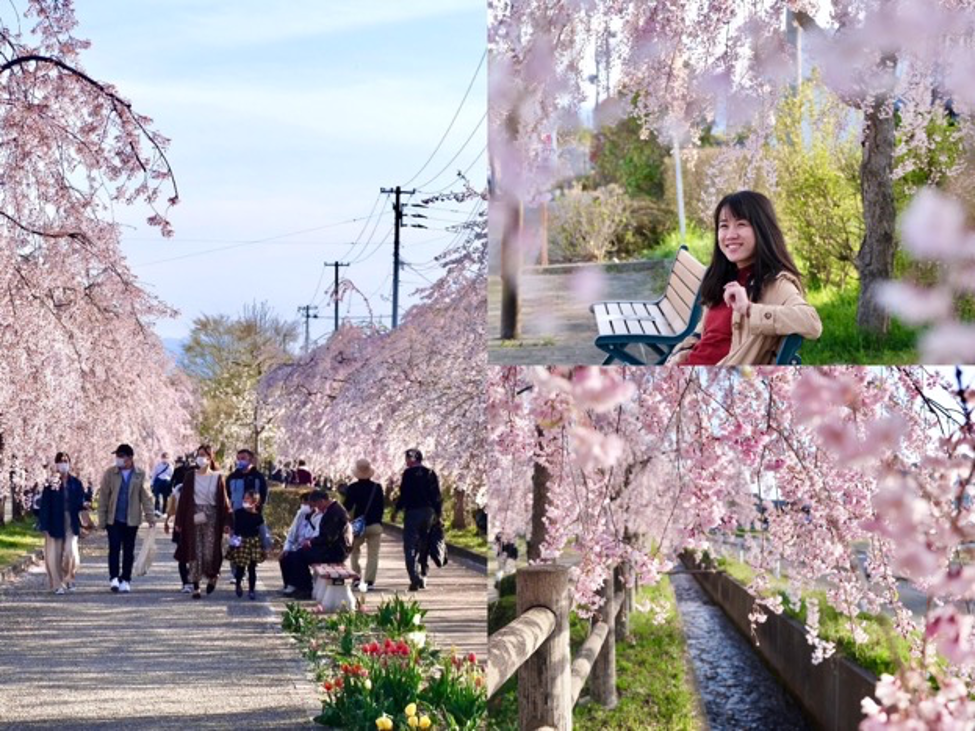 Chúng mình thật may mắn vì đã đến đây đúng vào lúc hoa anh đào nở rộ. Dọc theo con đường nhỏ có chiều dài khoảng 3km dành cho người đi bộ hay đi xe đạp là hơn 1.000 cây anh đào Shidare. Cả con đường được như được nhuộm lên màu hồng của hoa anh đào thực sự gây ấn tượng khó quên!