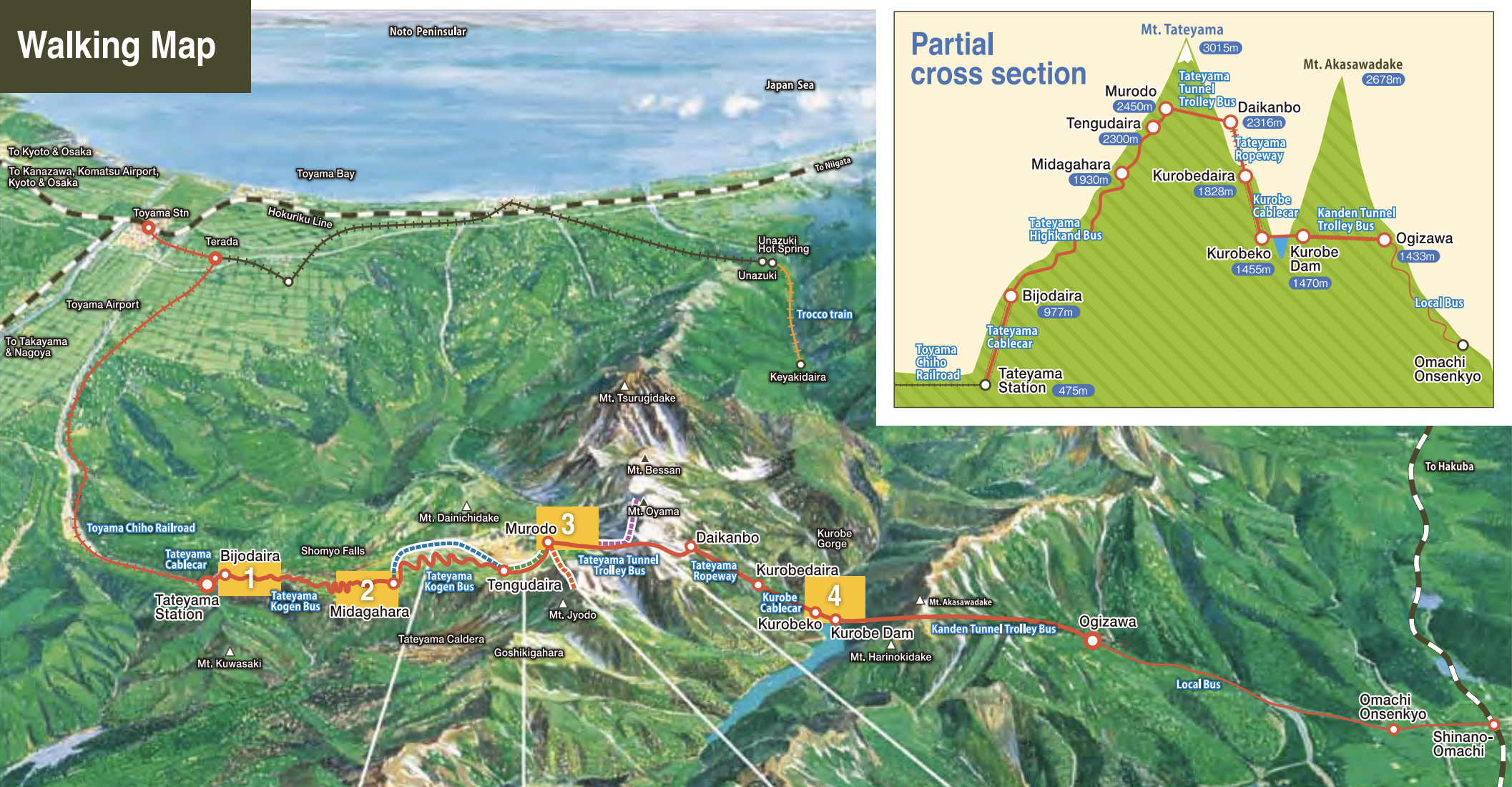 Tuyến đường núi Tateyama Kurobe Alpine Route. (Bấm để phóng to hình) (Nguồn ảnh: Tateyama Kurobe Kanko Co., Ltd.)