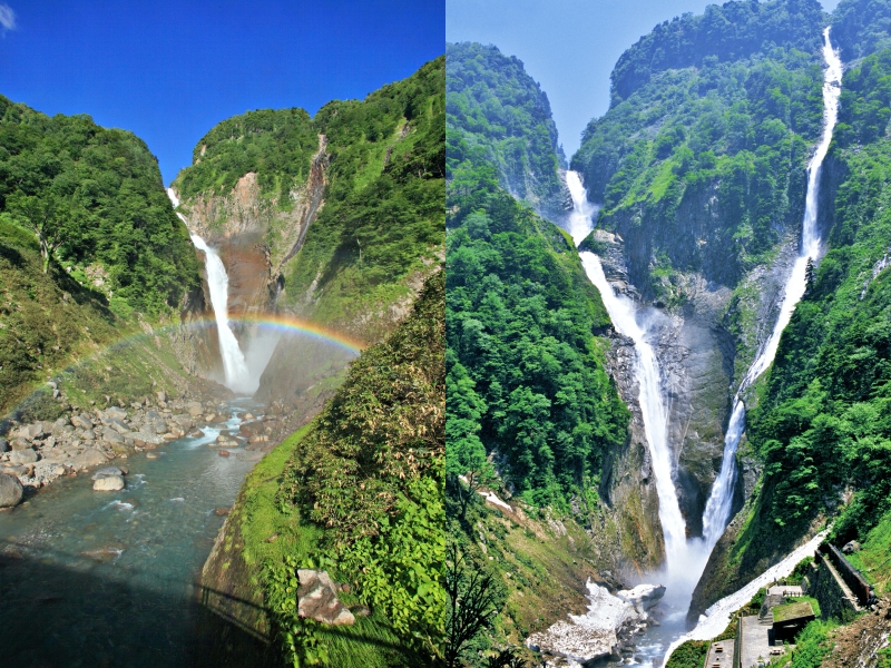 Thác Shomyo với cầu vồng (trái) và thác Hannoki (phải). (Nguồn ảnh: 公社)とやま観光推進機構  (trái) và JNTO (phải))