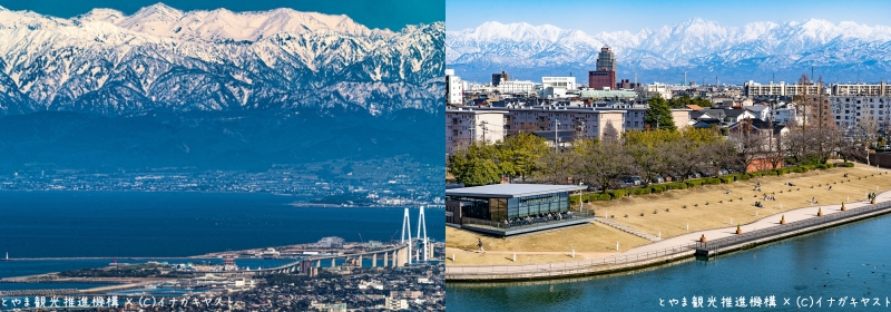 Thành phố Takaoka và thành phố Toyama với dãy núi Tateyama ở đằng sau (Nguồn ảnh: (公社)とやま観光推進機構)