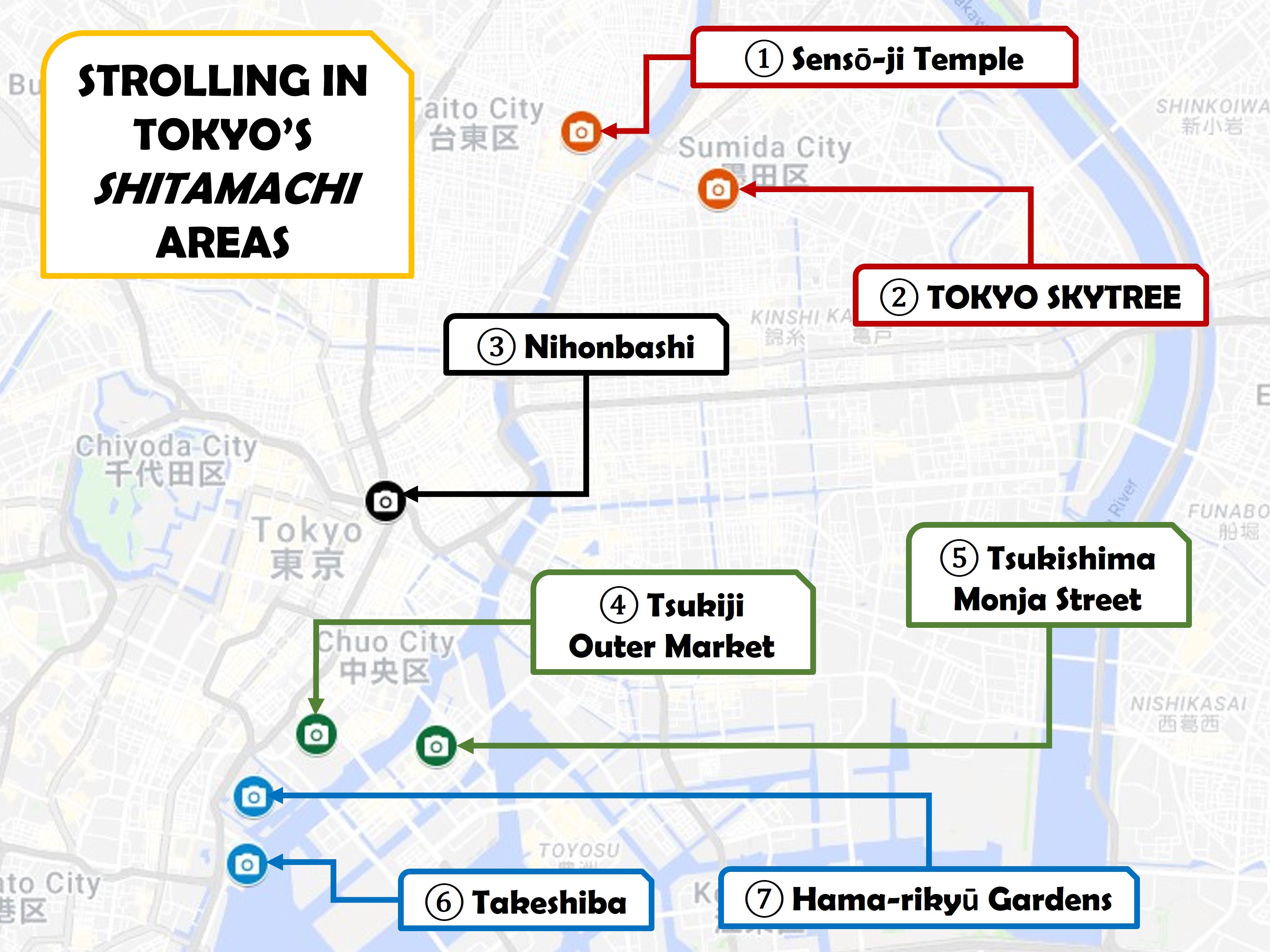 Trong bài viết này, chúng mình sẽ dạo quanh các khu shitamachi (下町) của Tokyo - những vùng trũng gần vịnh Tokyo (東京湾 Tōkyō-wan) và sông Sumida (隅田川 Sumida-gawa). Khu vực này bao gồm các quận nổi tiếng như Asakusa, Nihonbashi, Yaesu, Tsukiji, cùng nhiều quận khác... nơi đây vốn là trung tâm thành phố vào thời Edo (江戸 - tên cũ của Tokyo, thời Edo - 江 戸 時代 Edo-jidai - 1603–1867). Những khu vực này trải qua nhiều thay đổi lớn qua nhiều thế hệ, và đã biến thành các khu thương mại và giải trí vô cùn sôi động, náo nhiệt.