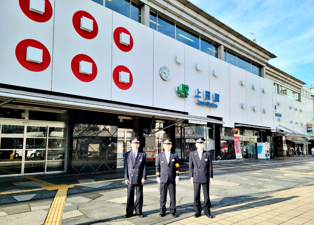 Phía ngoài ga Ueda và ba trưởng ga. (Nguồn ảnh: Ueda City Multimedia Information Center)