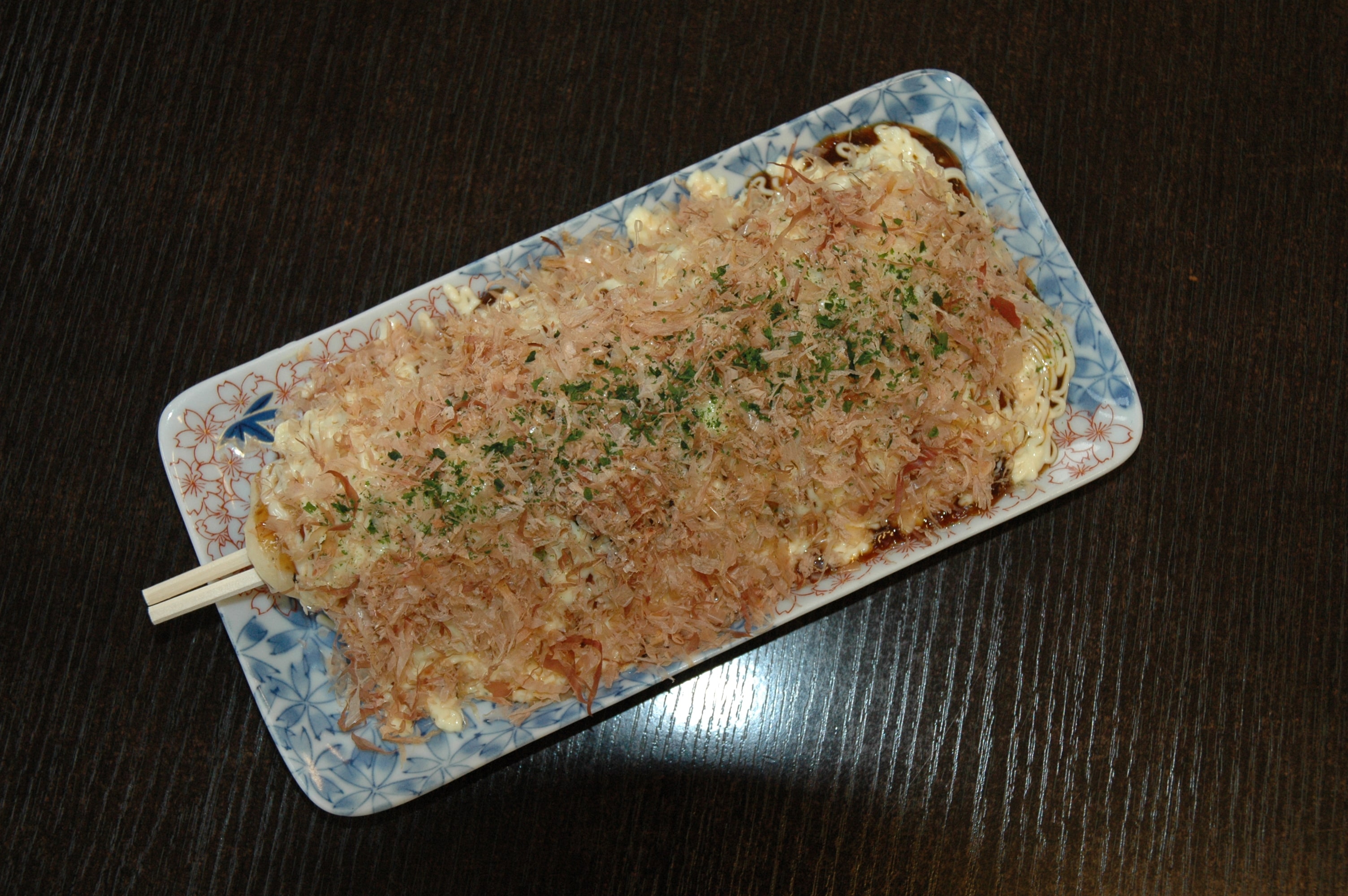 Okonomiyaki (お好み焼き) là món ăn đường phố tiêu biểu của Nhật Bản mà ai ai cũng biết. Nó là một loại bánh kếp mặn làm từ bột mì và phủ một lớp cá ngừ bào, sốt mayonnaise Nhật Bản cùng gừng ngâm. Mặc dù phiên bản phổ biến nhất là phiên bản vùng Osaka, nhưng có vô số phiên bản khác trên khắp đất nước: phiên bản vùng Hiroshima xếp lớp các thành phần lên trên, thay vì trộn chúng lại với nhau, và phiên bản modan-yaki (モダン焼き) thì có thêm mì trong phần nguyên liệu. Phiên bản ở thành phố trung tâm Yamagata, món này được xiên trên đũa.