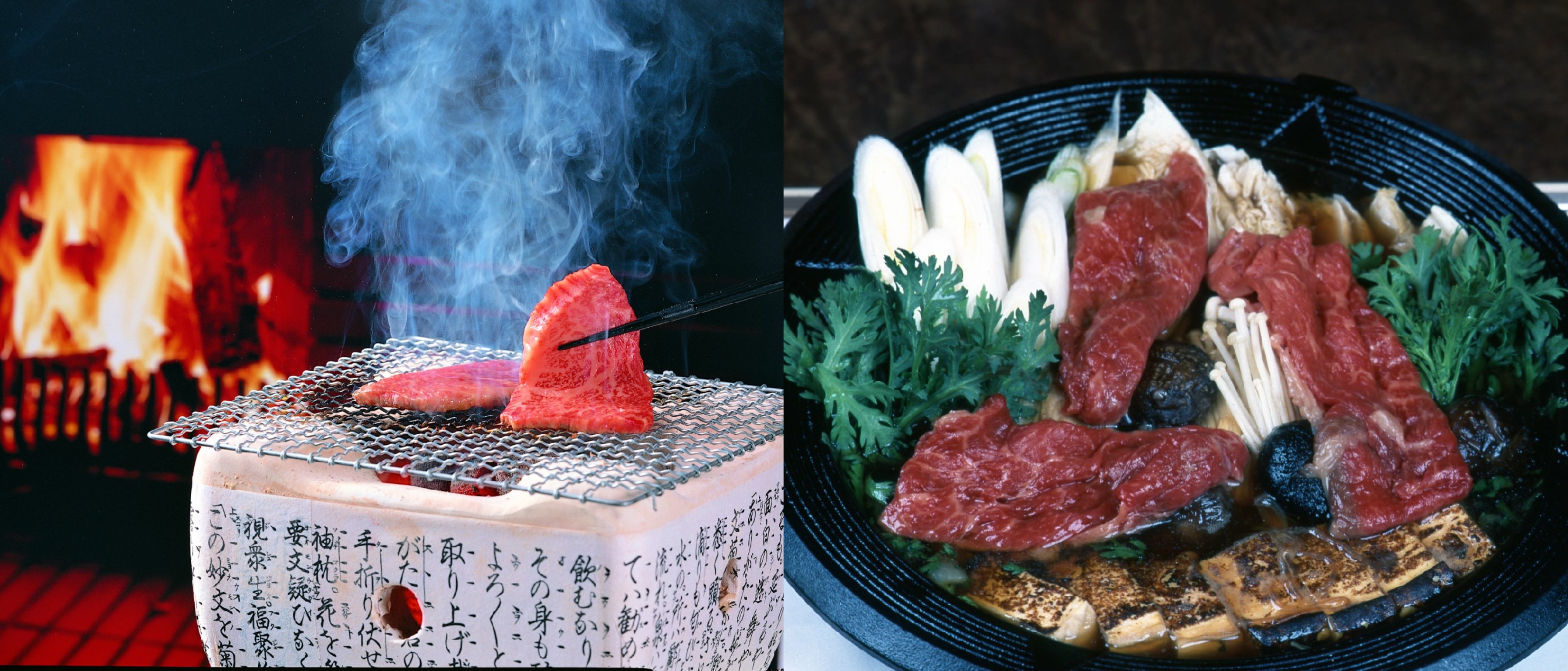 Thịt bò Yonezawa được chế biến thành yakiniku (thịt nướng) (ảnh bên trái) và lẩu sukiyaki (ảnh bên phải). (Nguồn ảnh: Tỉnh Yamagata)