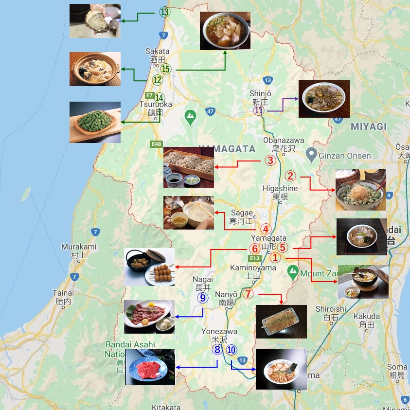 Bản đồ ẩm thực Yamagata theo xuất xứ của các món đặc sản địa phương (biểu thị bằng số) và các vùng (biểu thị bằng màu sắc): trung tâm Yamagata (① – ⑦ màu đỏ); phía nam Yamagata (⑧ – ⑩ màu xanh lam); phía bắc Yamagata (⑪ màu tím); và Shōnai ở vùng cực tây bắc (⑫ – ⑮ màu xanh lá cây đậm). (Nguồn ảnh: Google Maps/ Yamagata Prefecture)